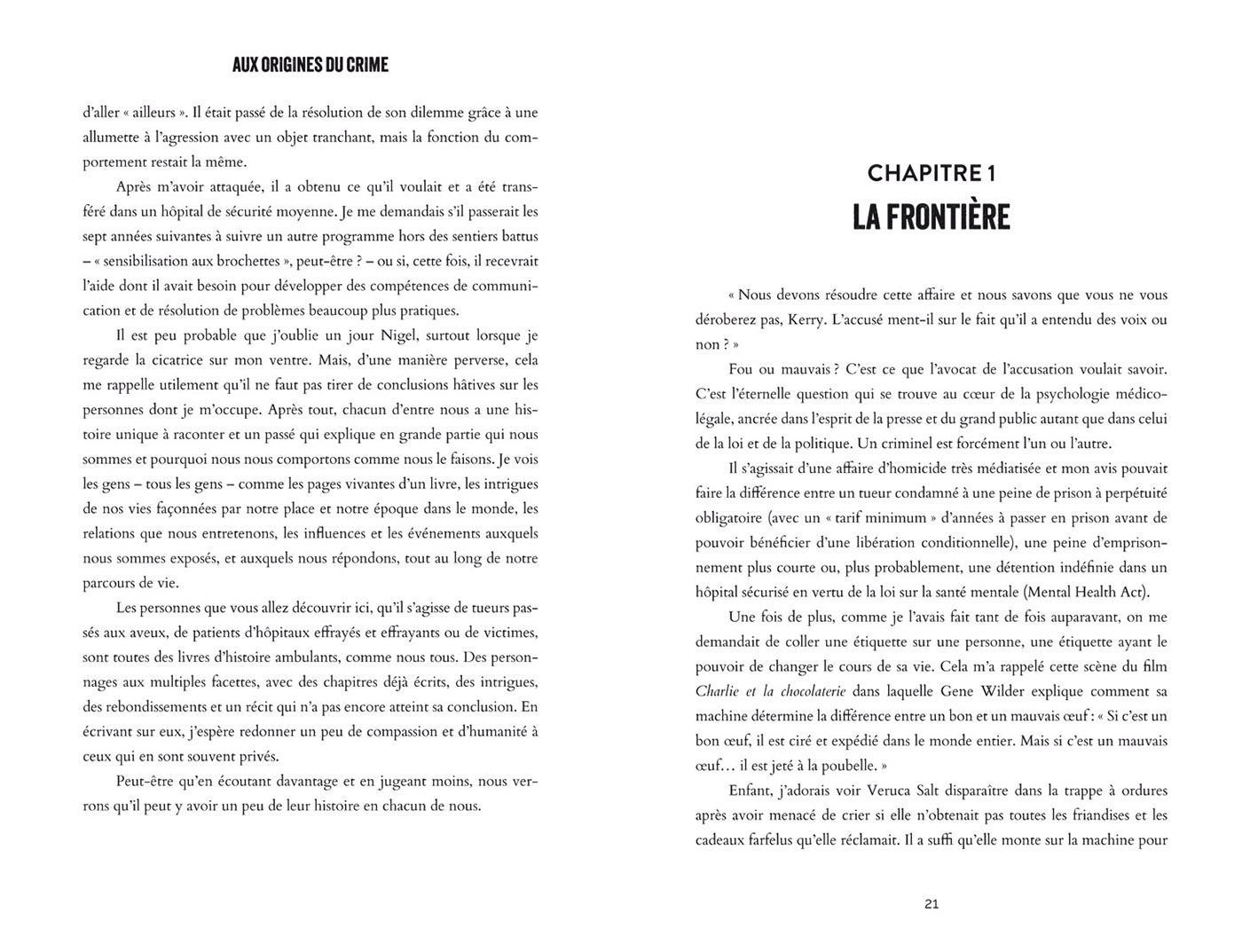 Kerry Daynes, dite "The Profiler", partage dans ce livre ses dossiers les plus déroutants, à la recherche d'une explication aux comportements glaçants de ses clients. Un meurtrier qui dit avoir entendu des voix lui ordonnant de tuer ? Une enseignante qui badigeonne les enfants de peinture rouge et menace de les enlever ? Un aspirant serial killer qui s'évanouit à la vue du sang ? Elle livre ici une analyse sans concession de la psyché de dix criminels, mettant en relief les causes enfouies de leur comportement et bousculant nos certitudes les plus ancrées sur la responsabilité des actes de chacun.